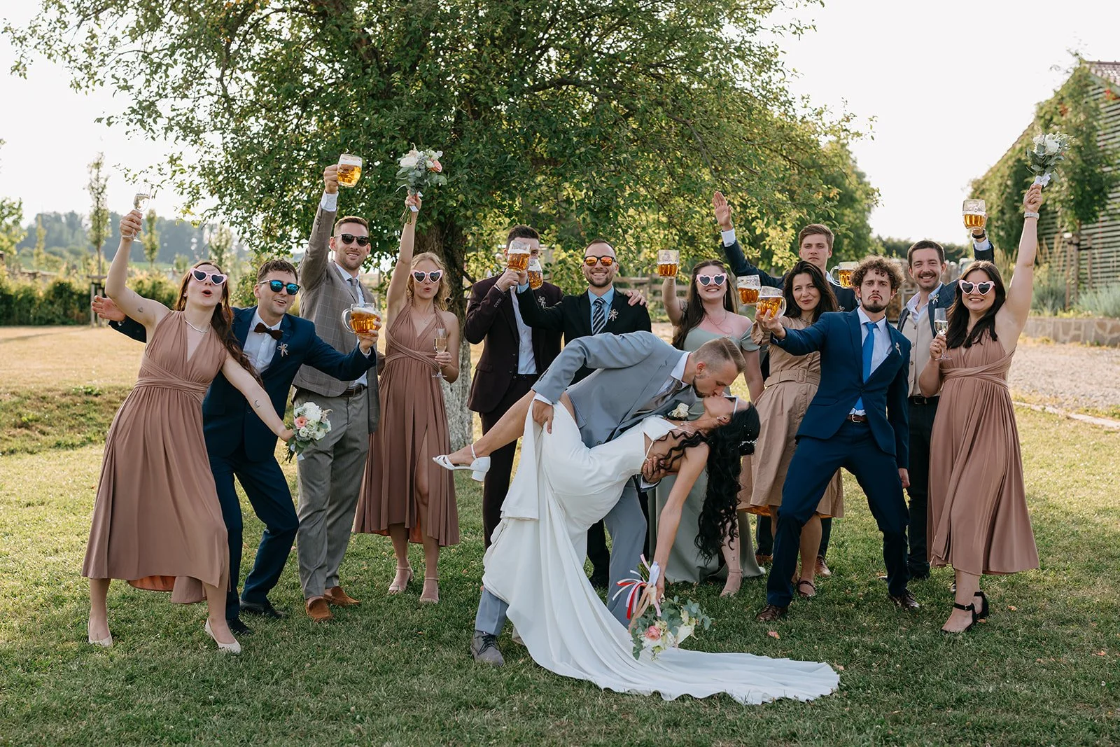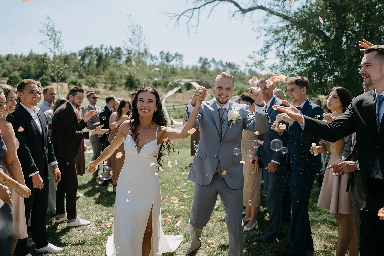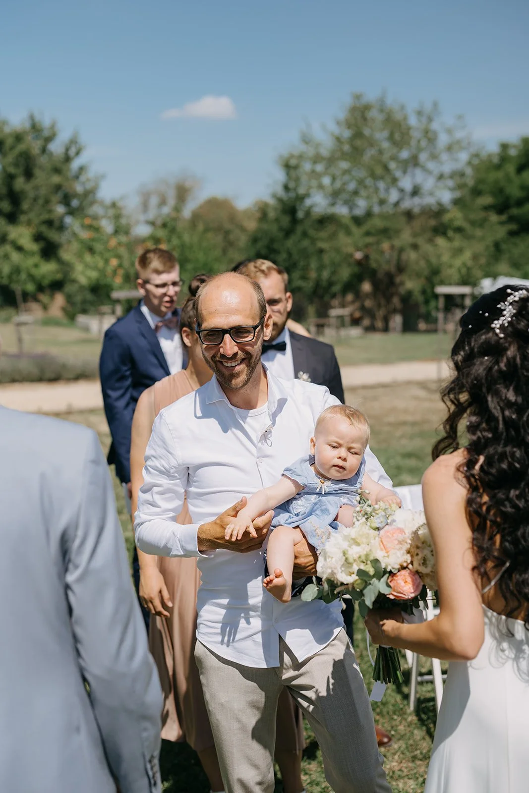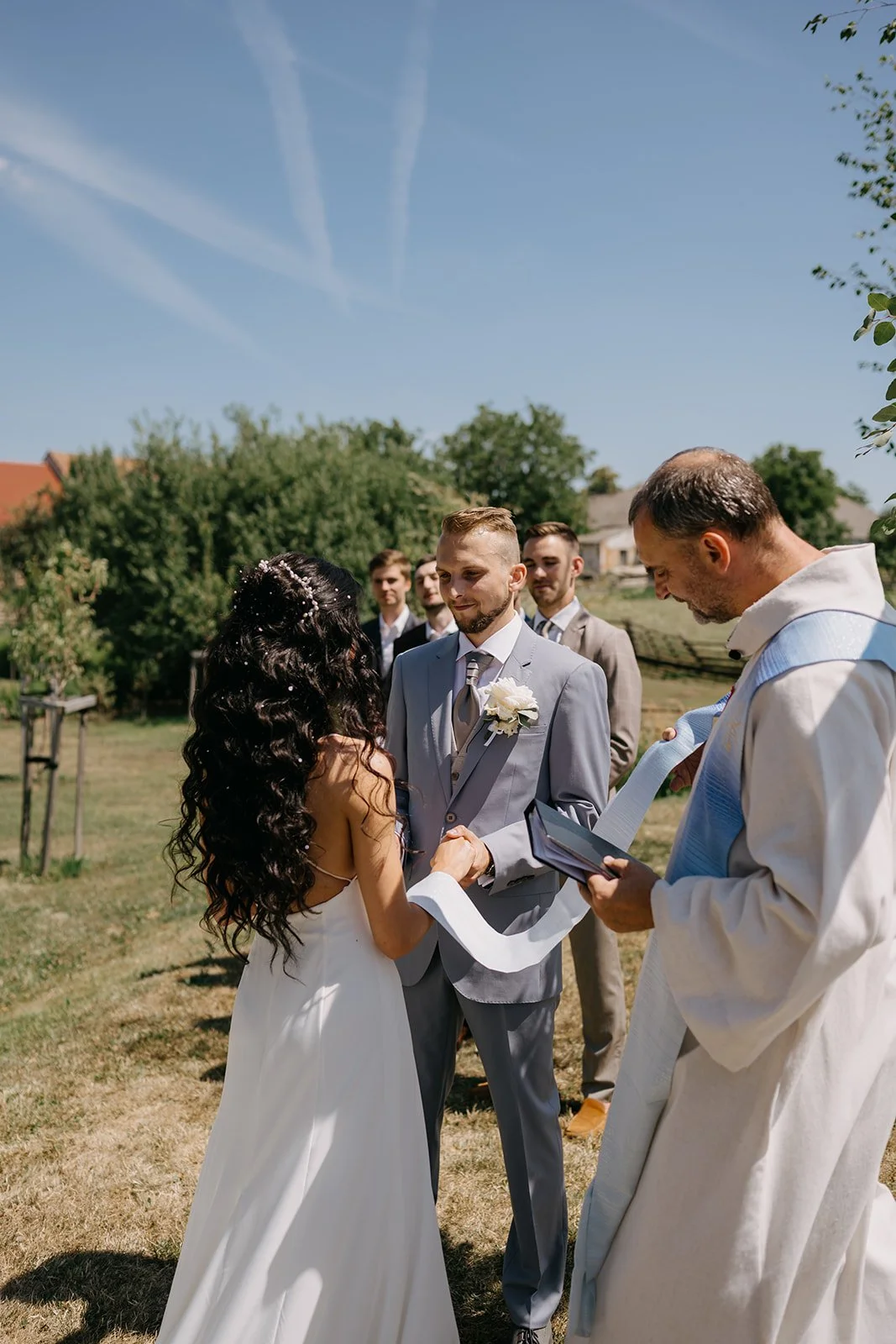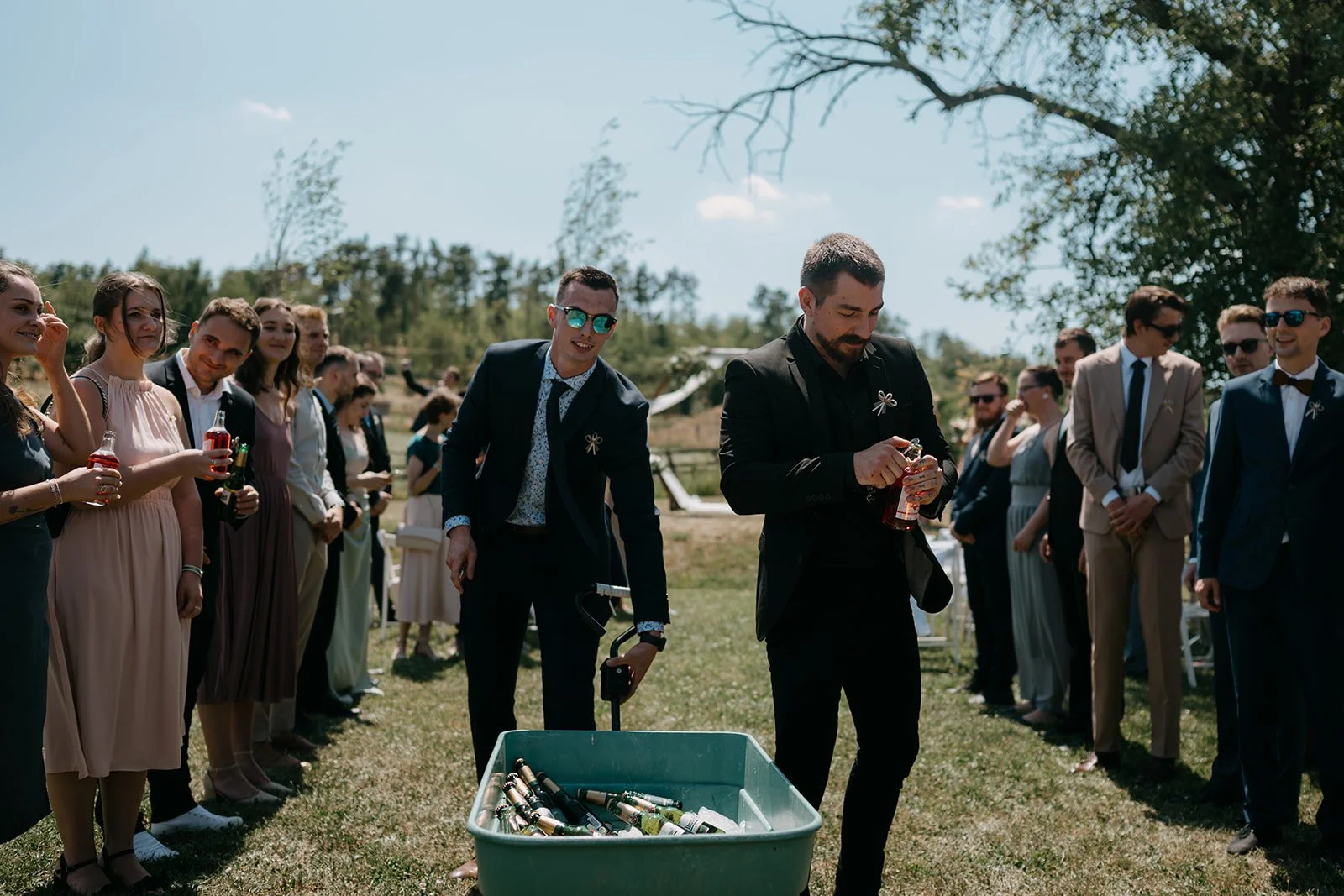 Místo komorního dne se tu sešla velká banda kamarádů, spousta smíchu a energie, která byla cítit od první chvíle. Nechyběly ani vtipné momenty, jako třeba „flower boys“, kteří před obřadem rozdávali vychlazené nápoje a hned nastavili tón celému dni. Uvolněný, lehký, bez zbytečné vážnosti.