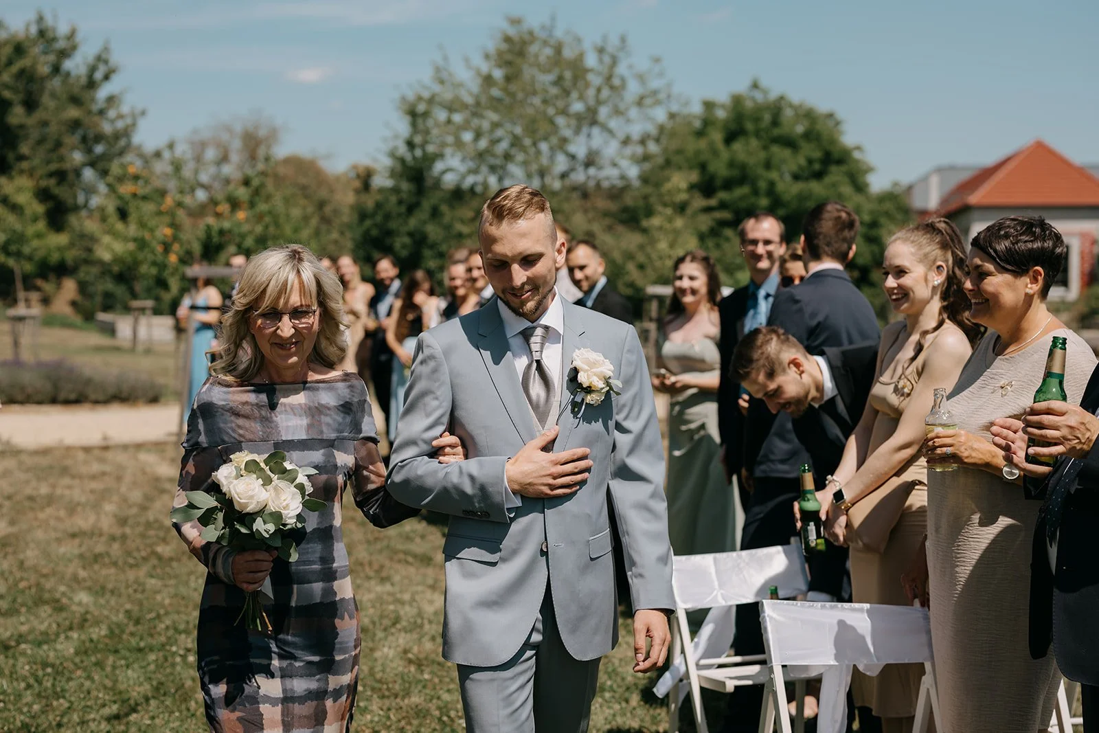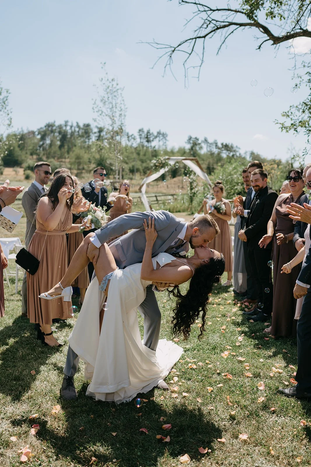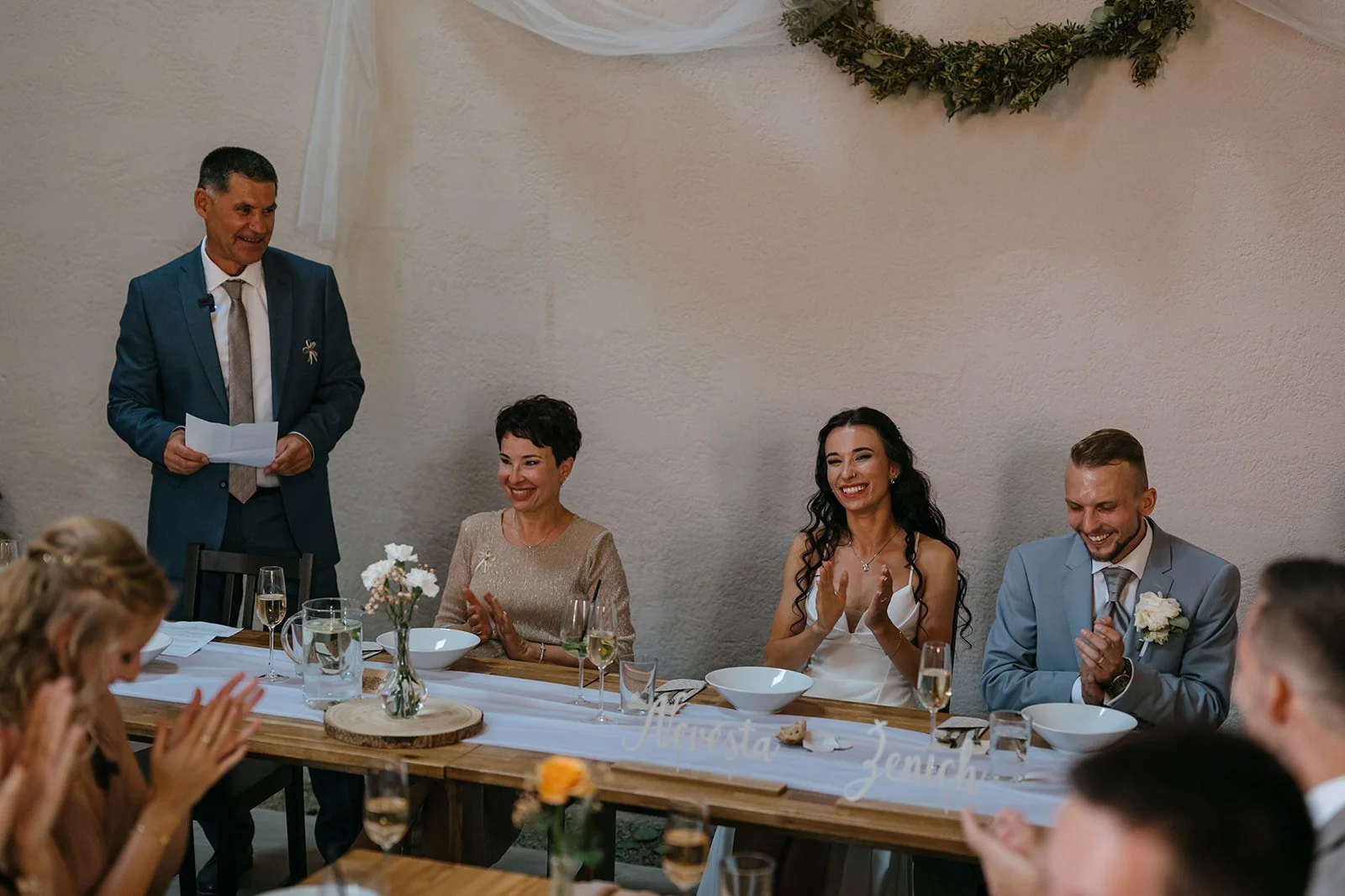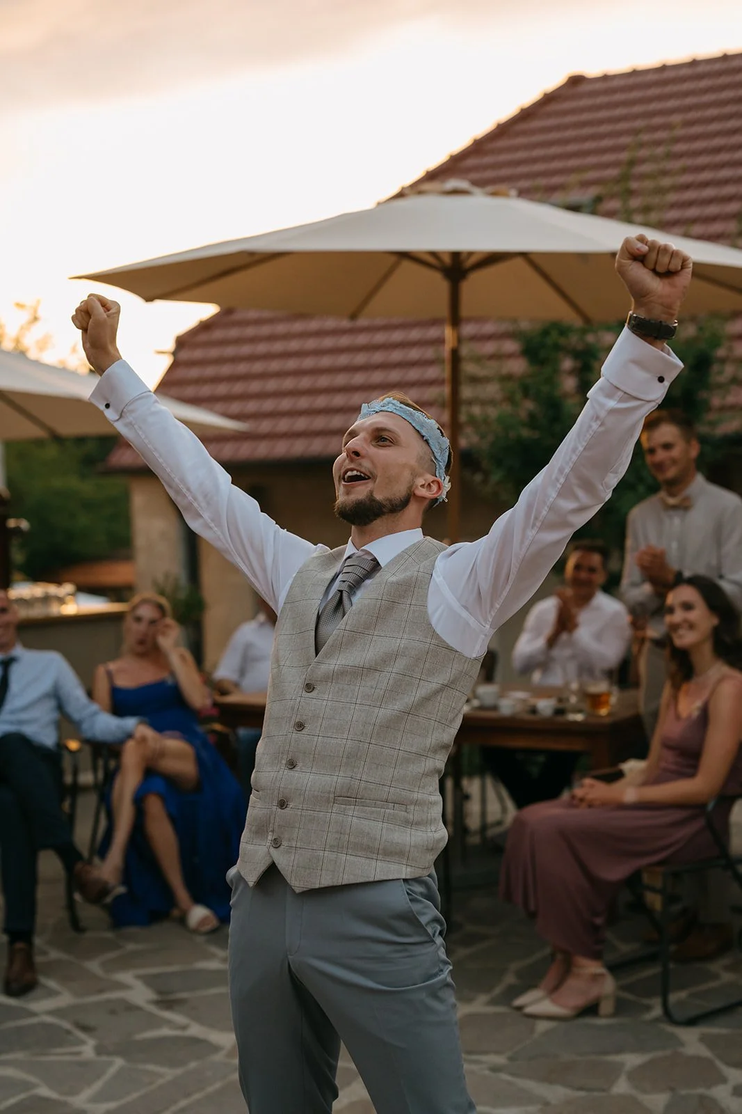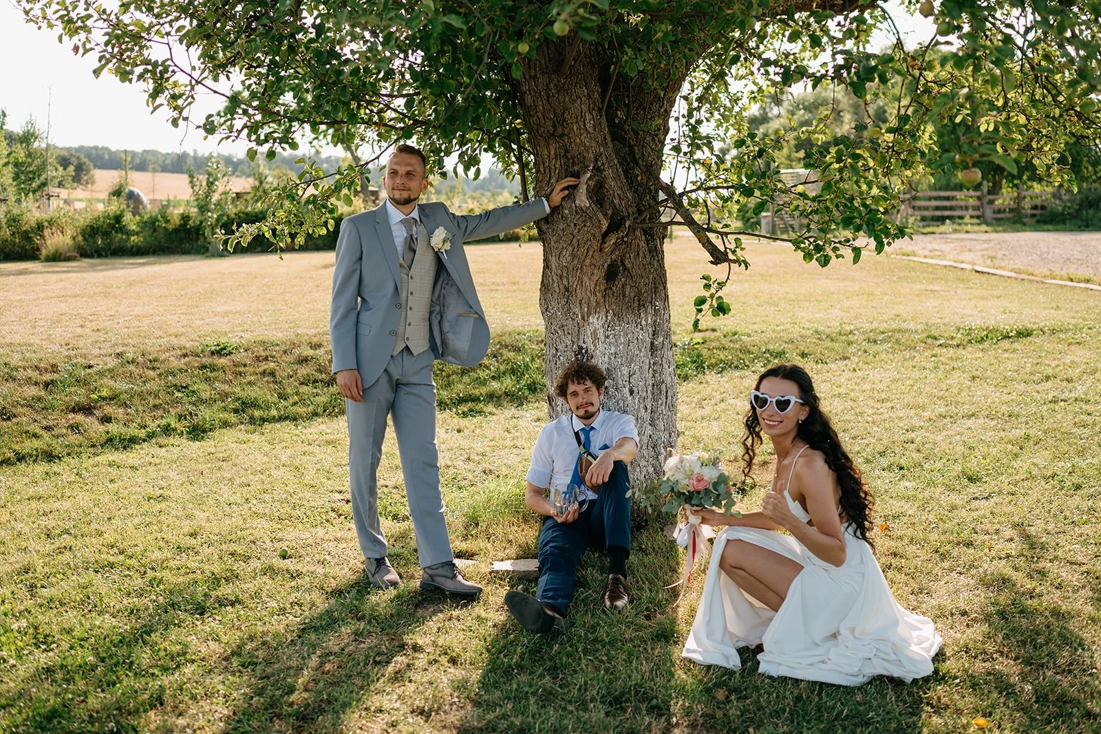Místo komorního dne se tu sešla velká banda kamarádů, spousta smíchu a energie, která byla cítit od první chvíle. Nechyběly ani vtipné momenty, jako třeba „flower boys“, kteří před obřadem rozdávali vychlazené nápoje a hned nastavili tón celému dni. Uvolněný, lehký, bez zbytečné vážnosti.