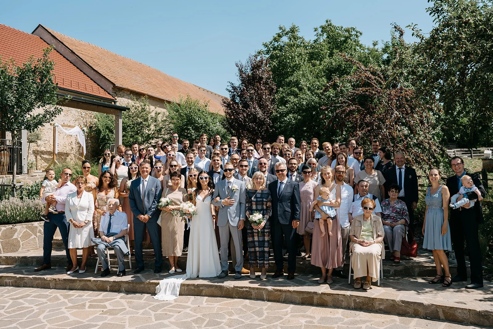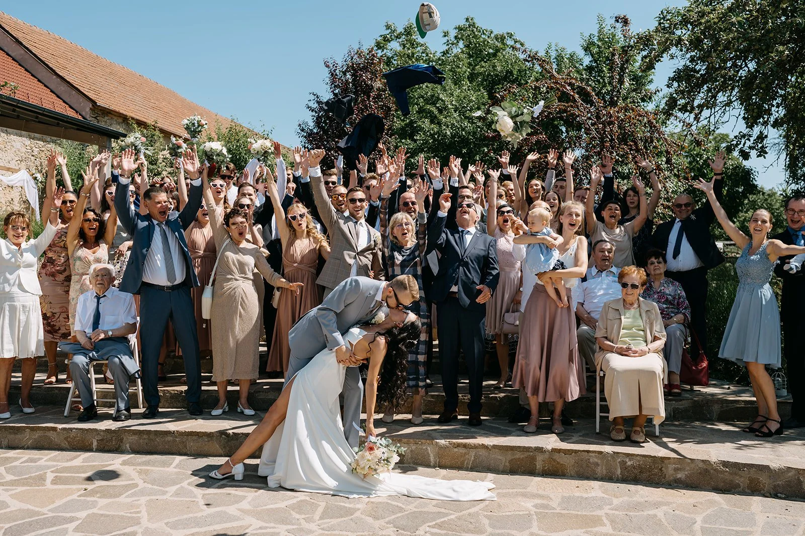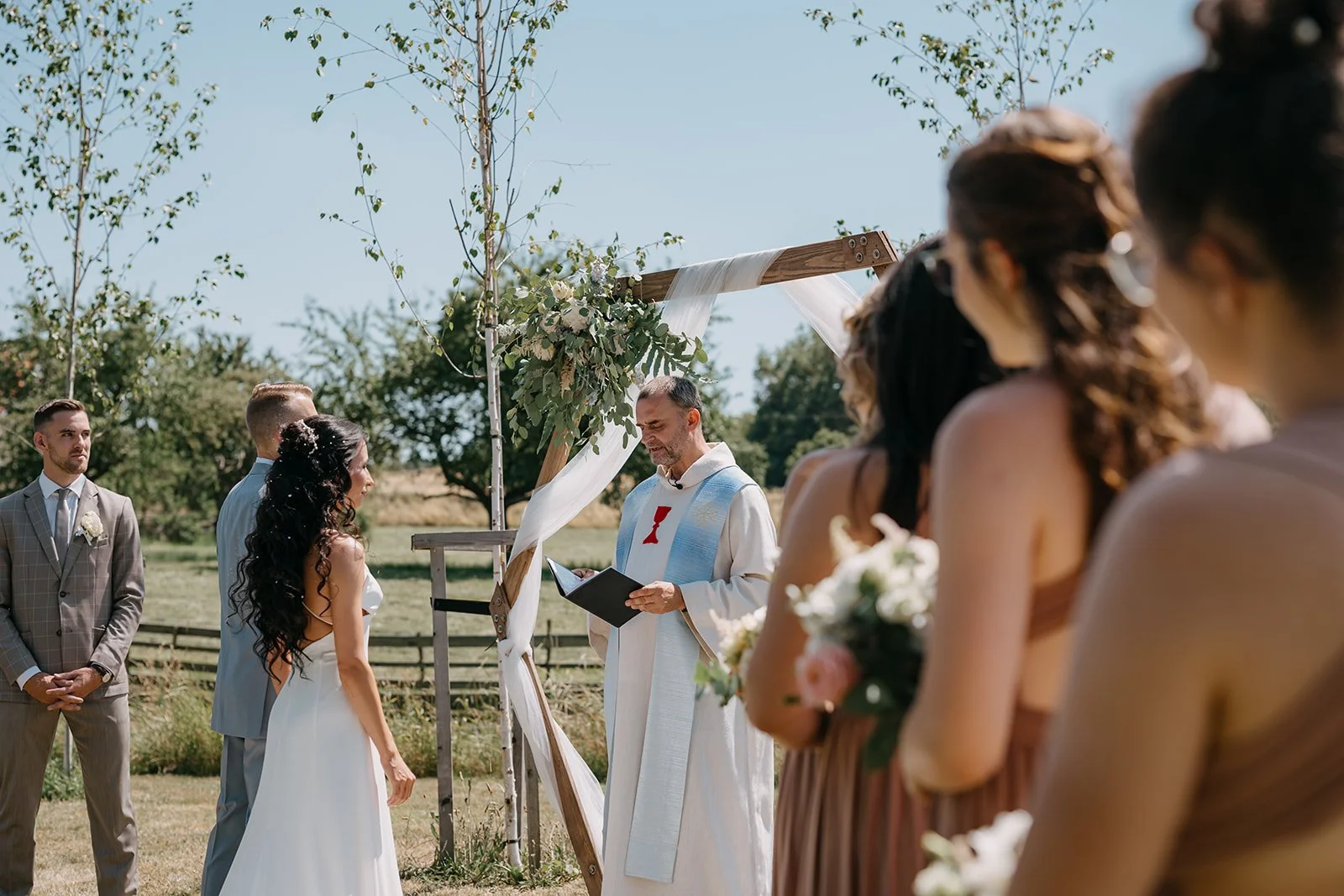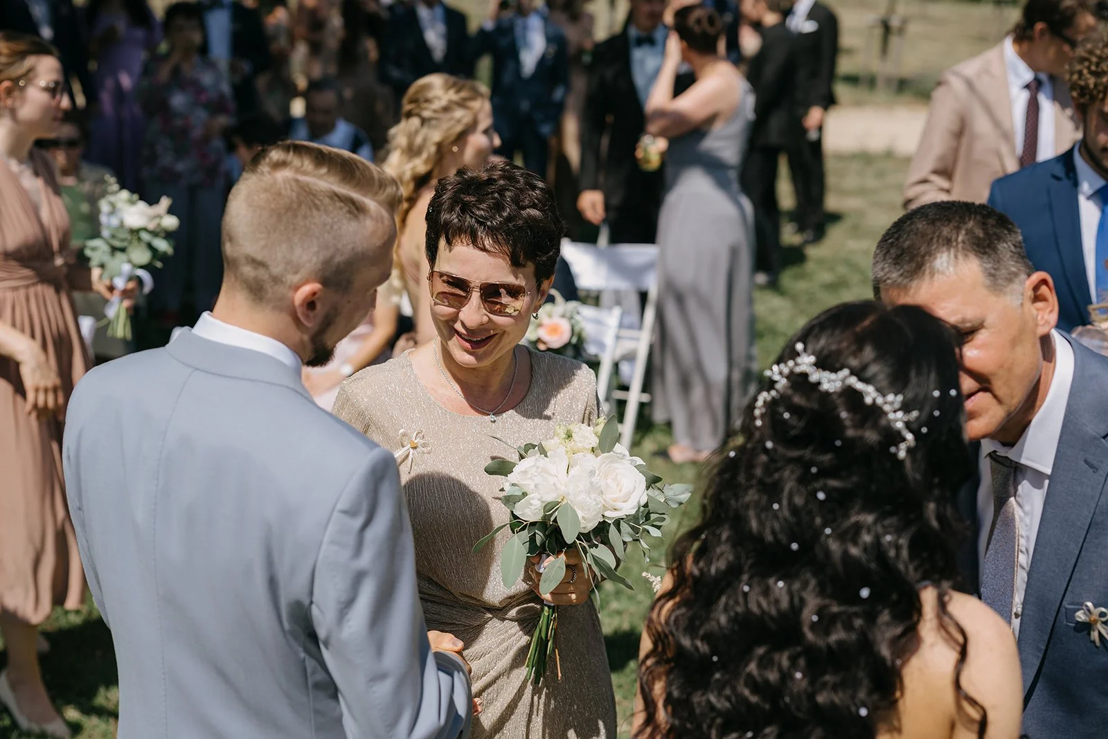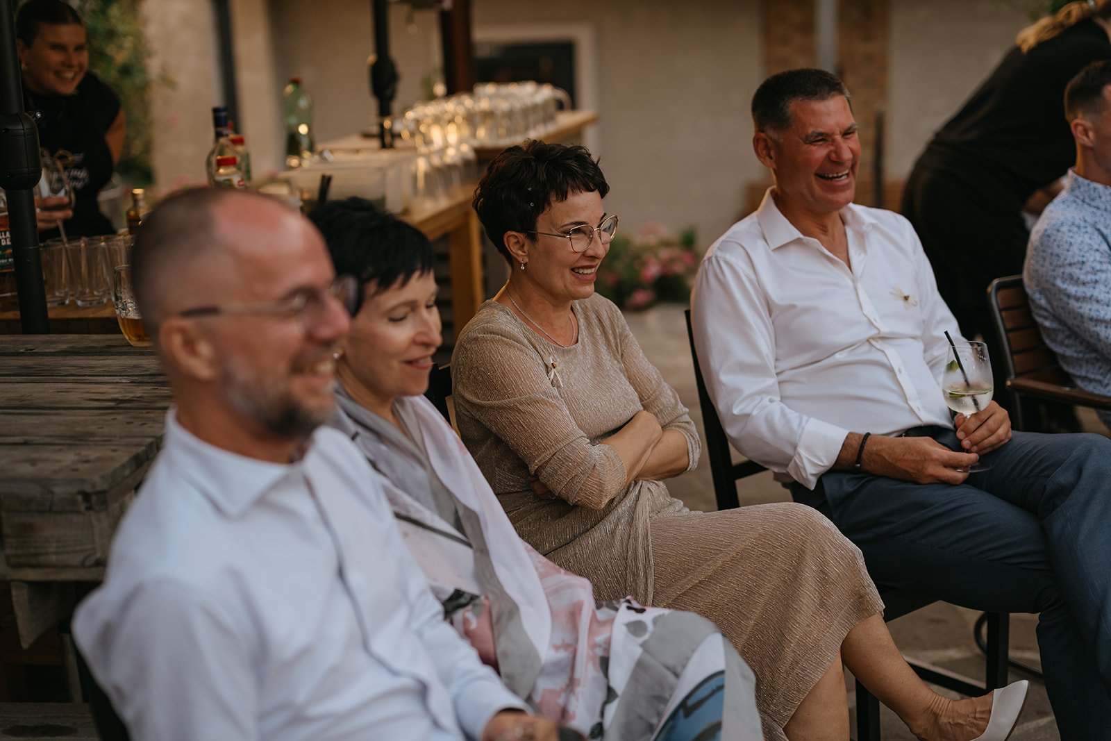 Místo komorního dne se tu sešla velká banda kamarádů, spousta smíchu a energie, která byla cítit od první chvíle. Nechyběly ani vtipné momenty, jako třeba „flower boys“, kteří před obřadem rozdávali vychlazené nápoje a hned nastavili tón celému dni. Uvolněný, lehký, bez zbytečné vážnosti.