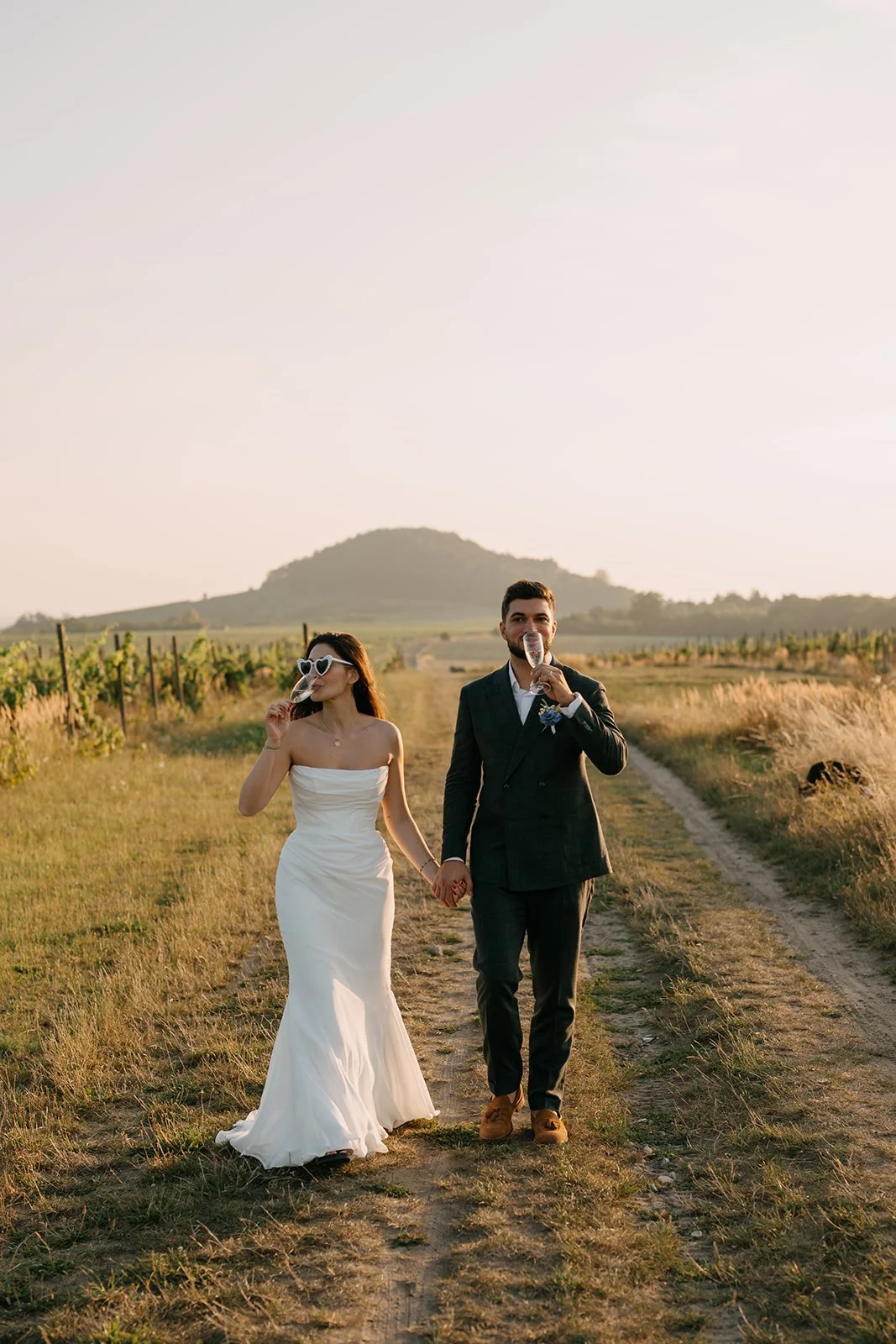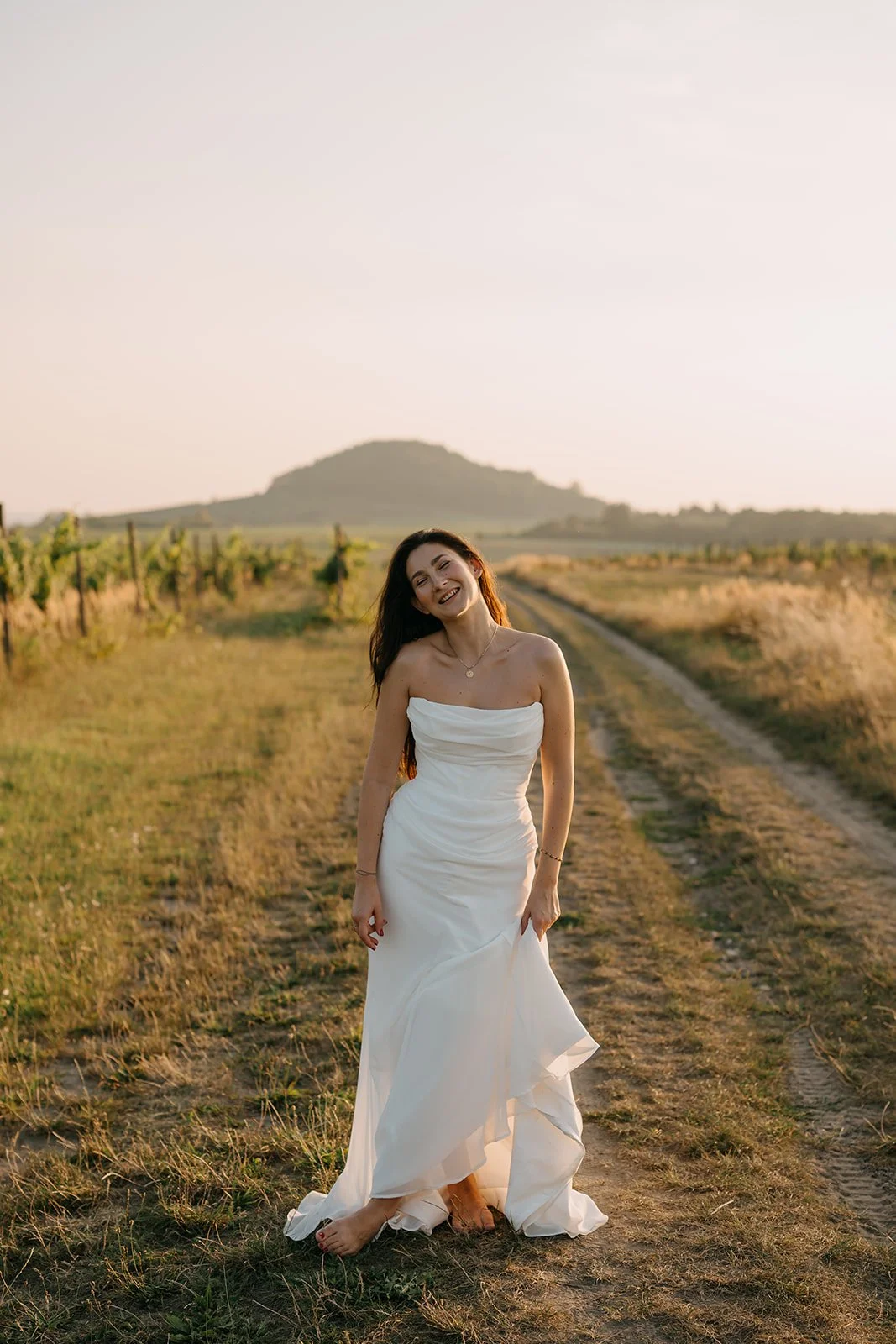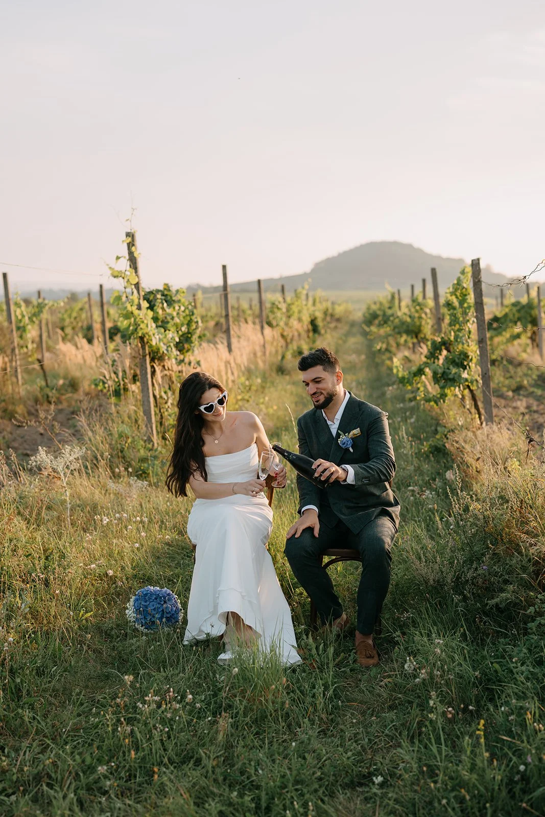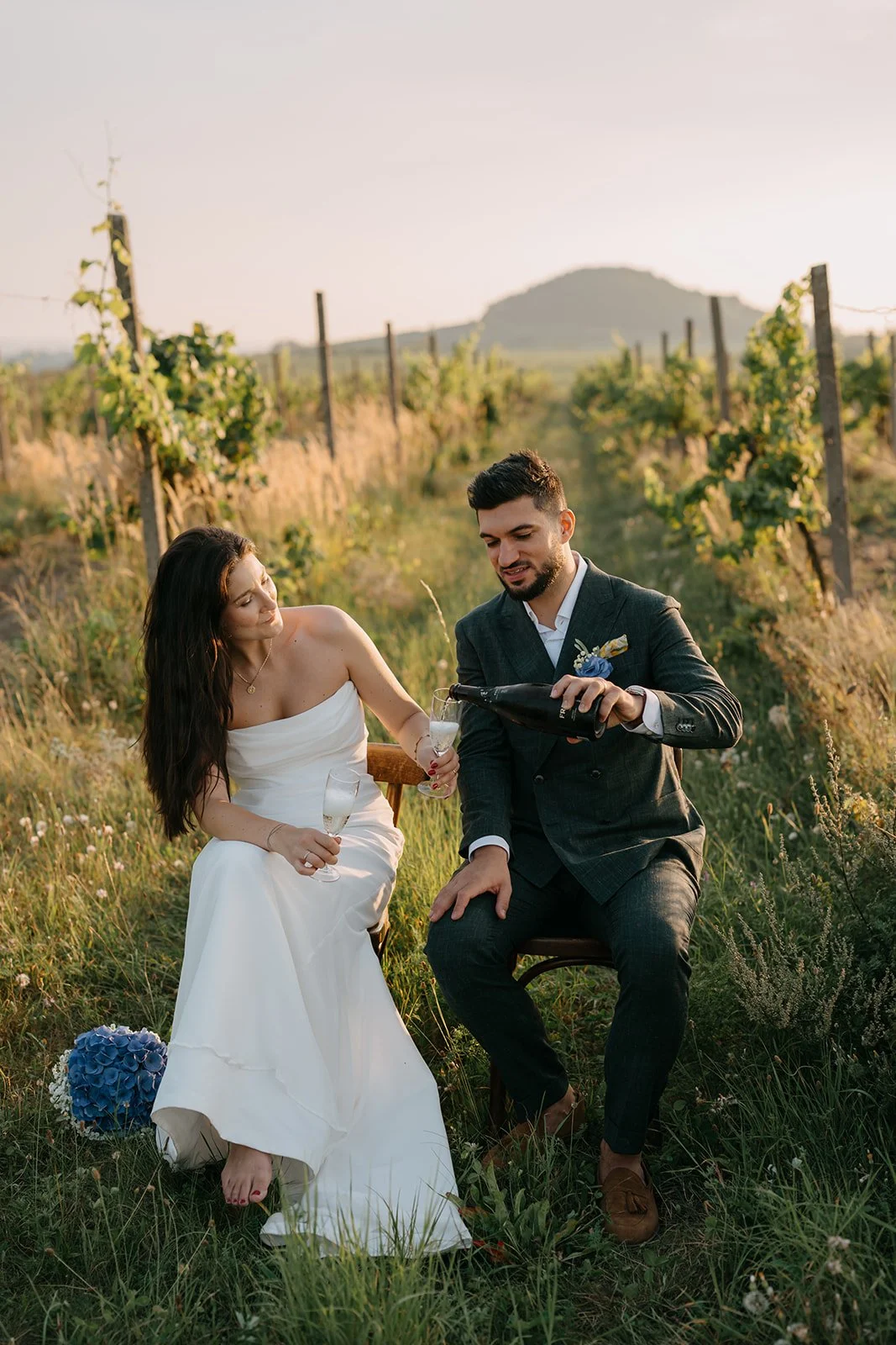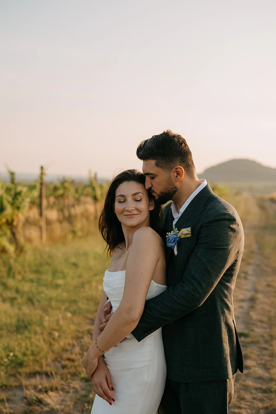 Místo dortu zdobení tiramisu, večerní hry pod širým nebem, pohoda bez spěchu a atmosféra, která vzniká, když si svatbu nastavíte přesně podle sebe. Párové focení mezi vinicemi v měkkém večerním světle pak celý den krásně uzavřelo.