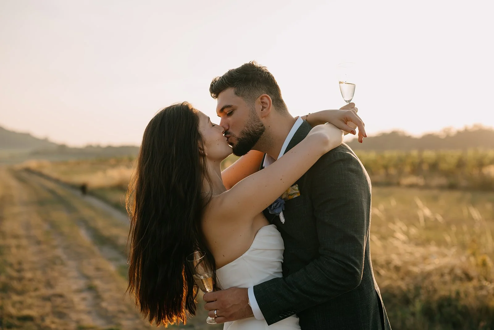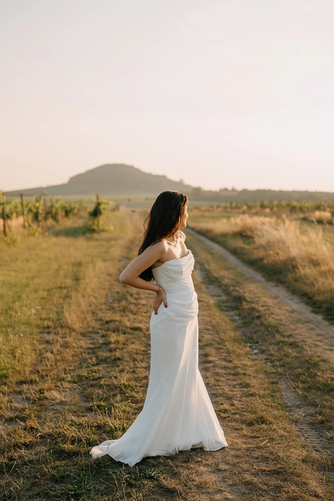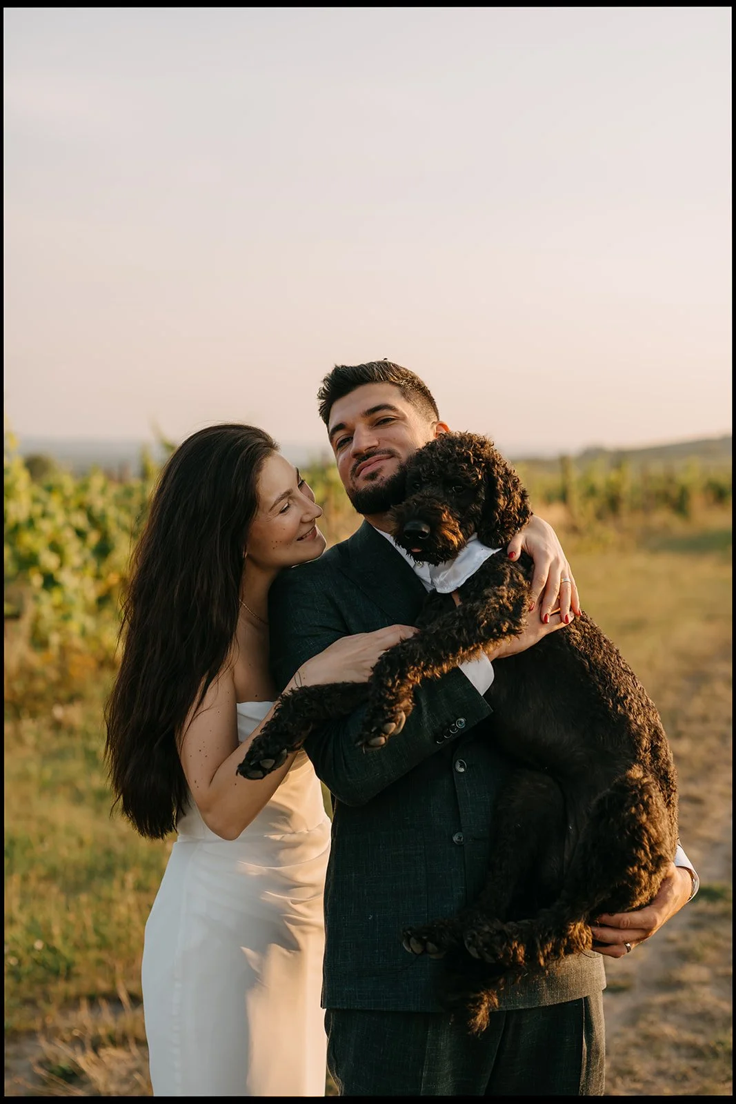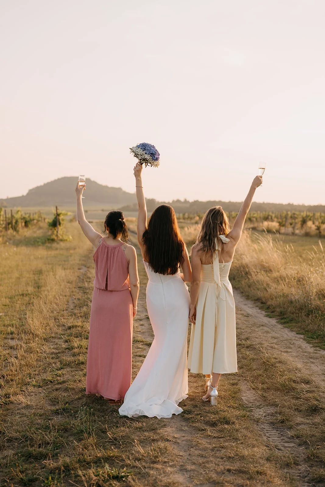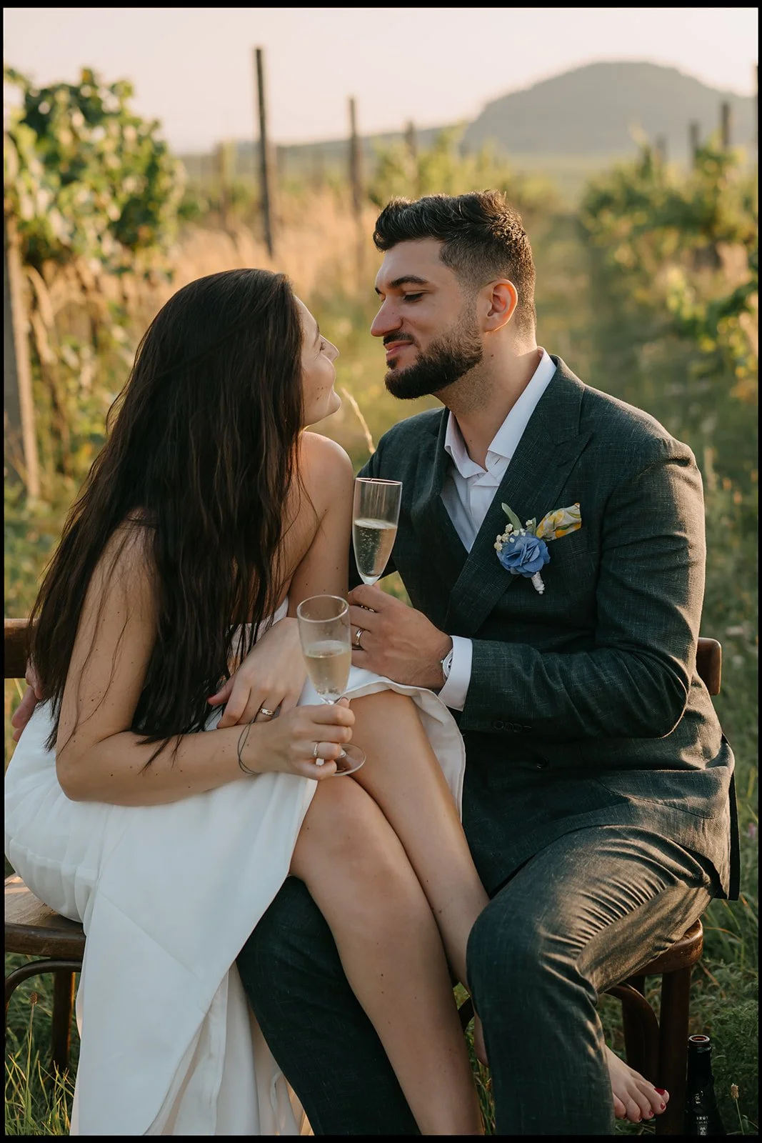 Místo dortu zdobení tiramisu, večerní hry pod širým nebem, pohoda bez spěchu a atmosféra, která vzniká, když si svatbu nastavíte přesně podle sebe. Párové focení mezi vinicemi v měkkém večerním světle pak celý den krásně uzavřelo.