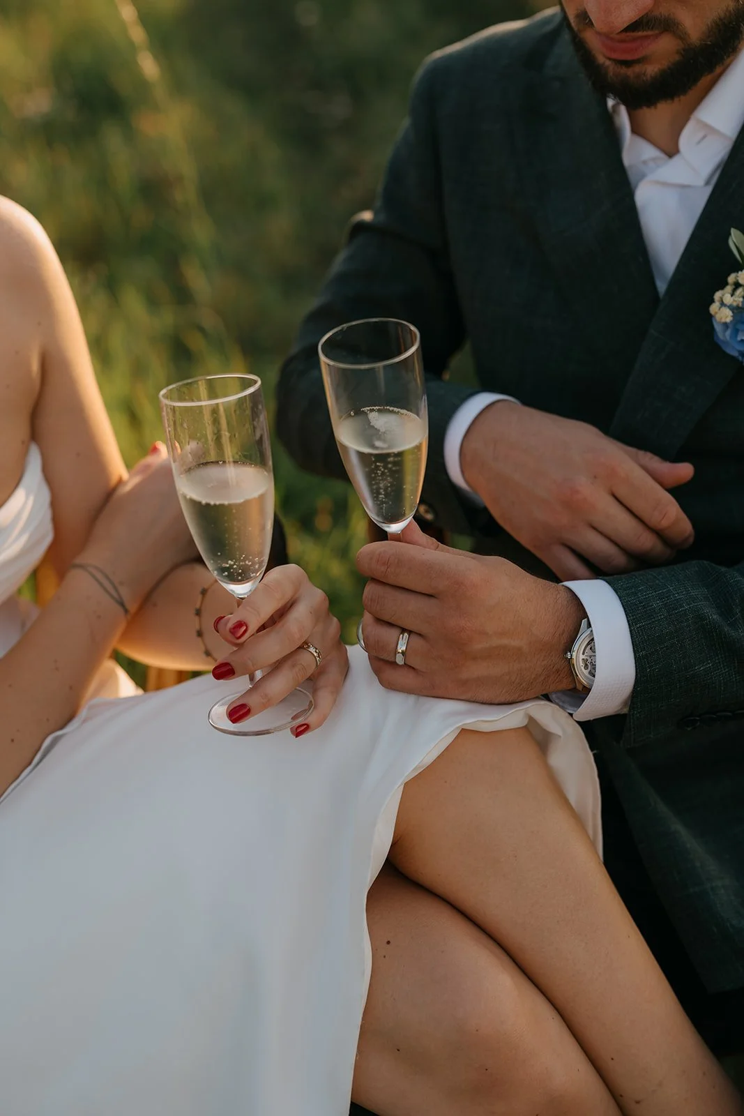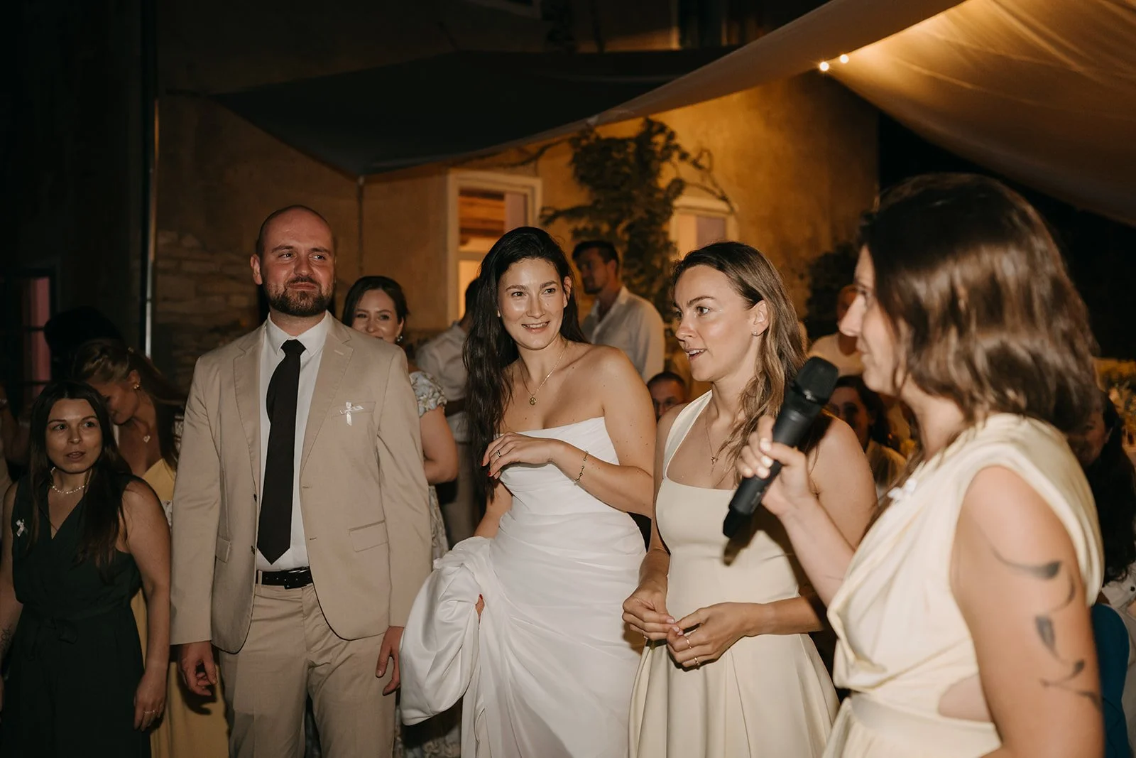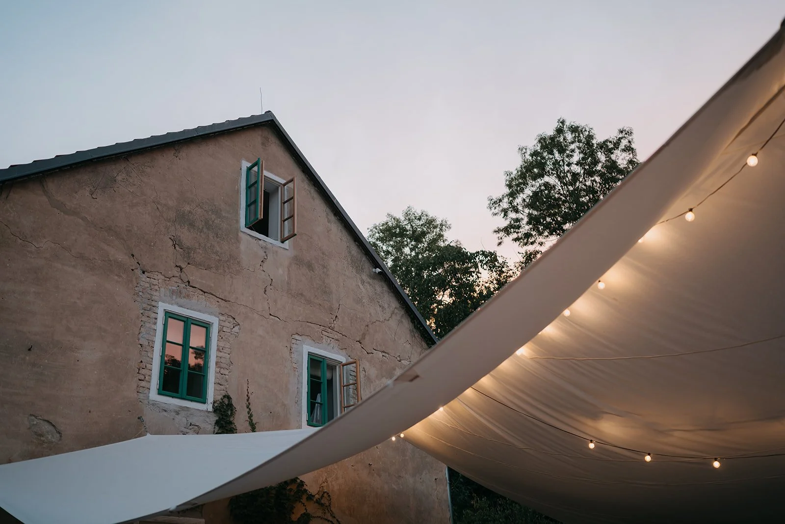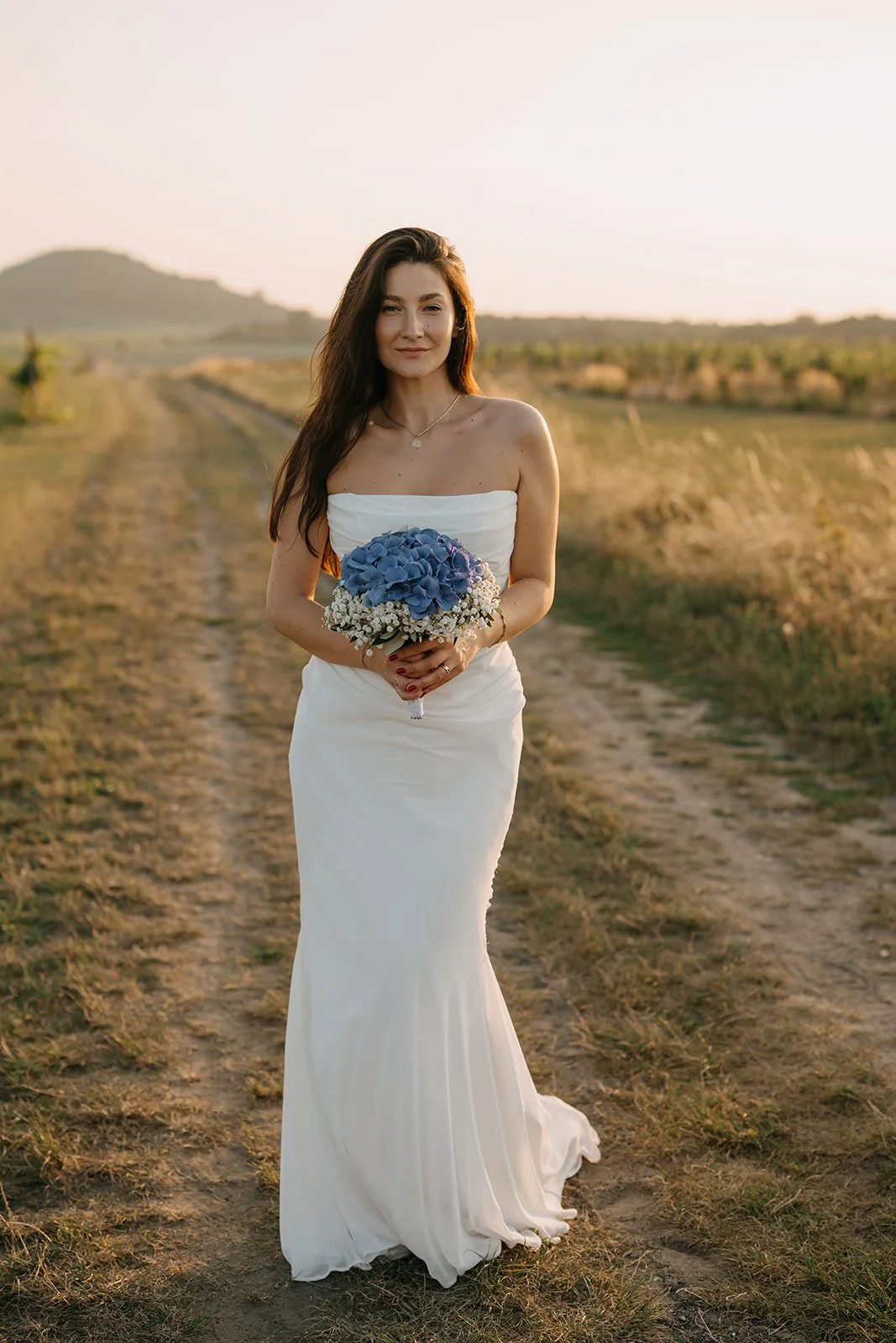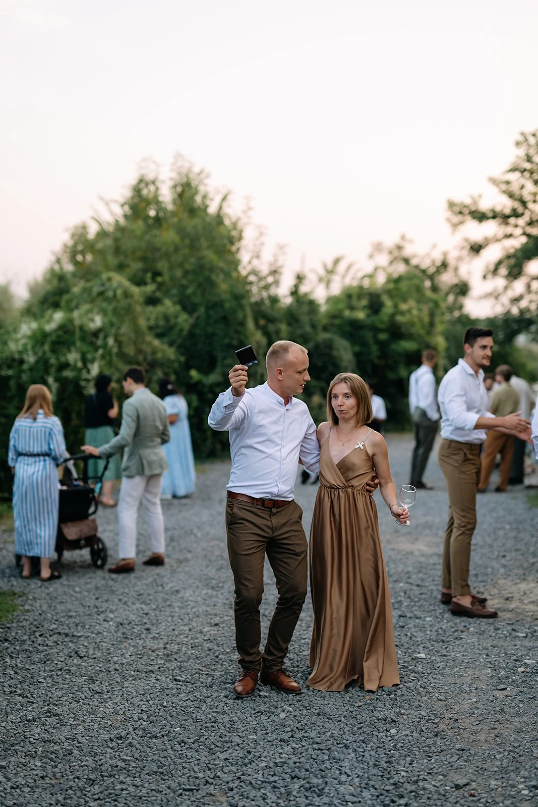Místo dortu zdobení tiramisu, večerní hry pod širým nebem, pohoda bez spěchu a atmosféra, která vzniká, když si svatbu nastavíte přesně podle sebe. Párové focení mezi vinicemi v měkkém večerním světle pak celý den krásně uzavřelo.