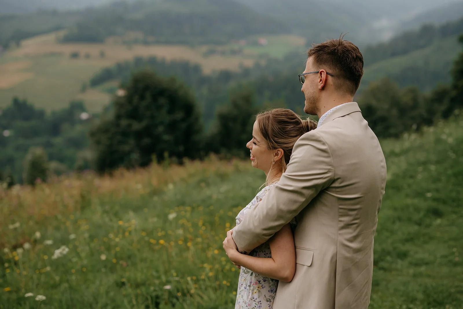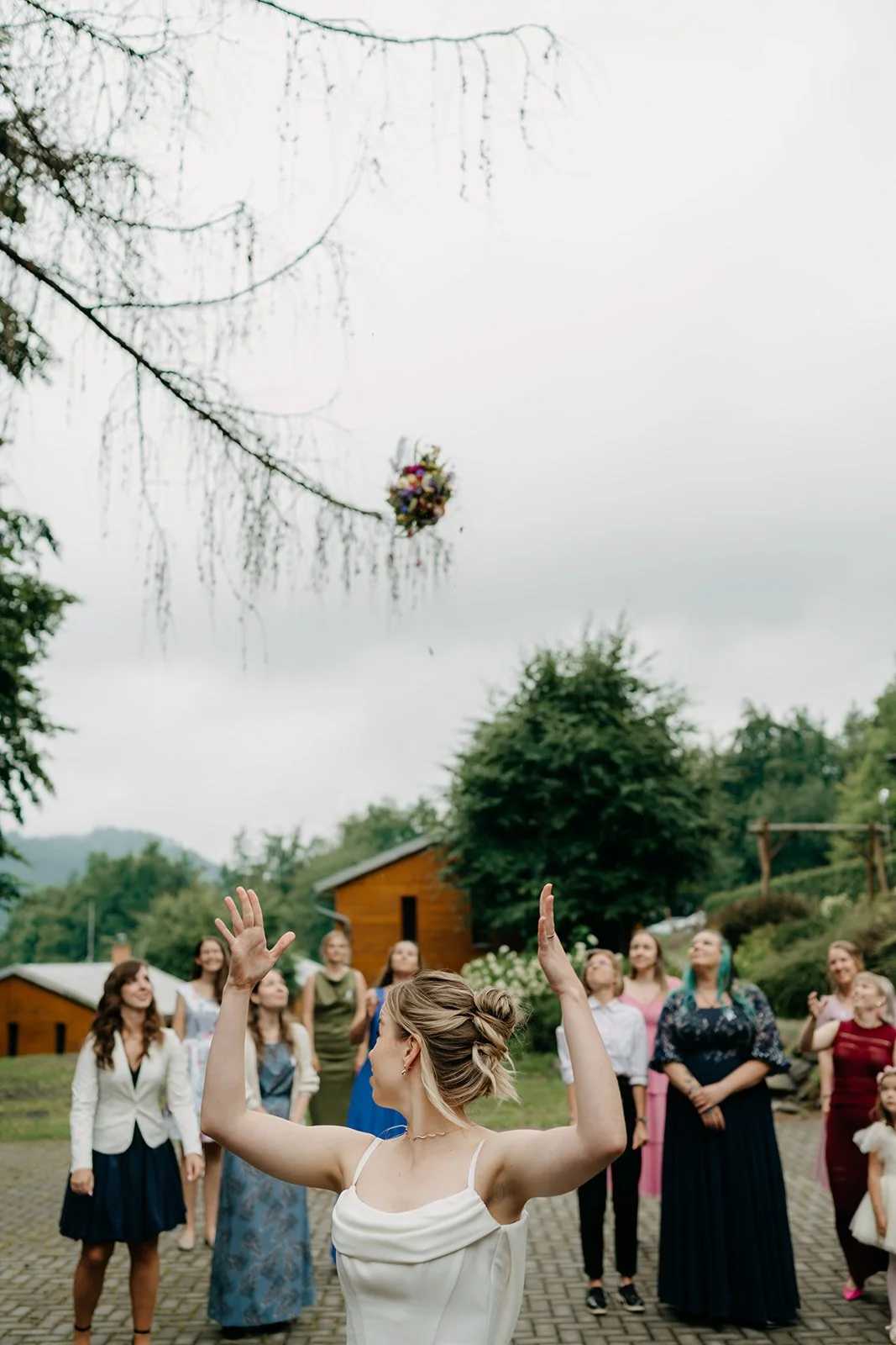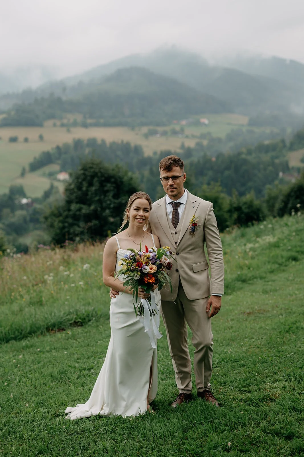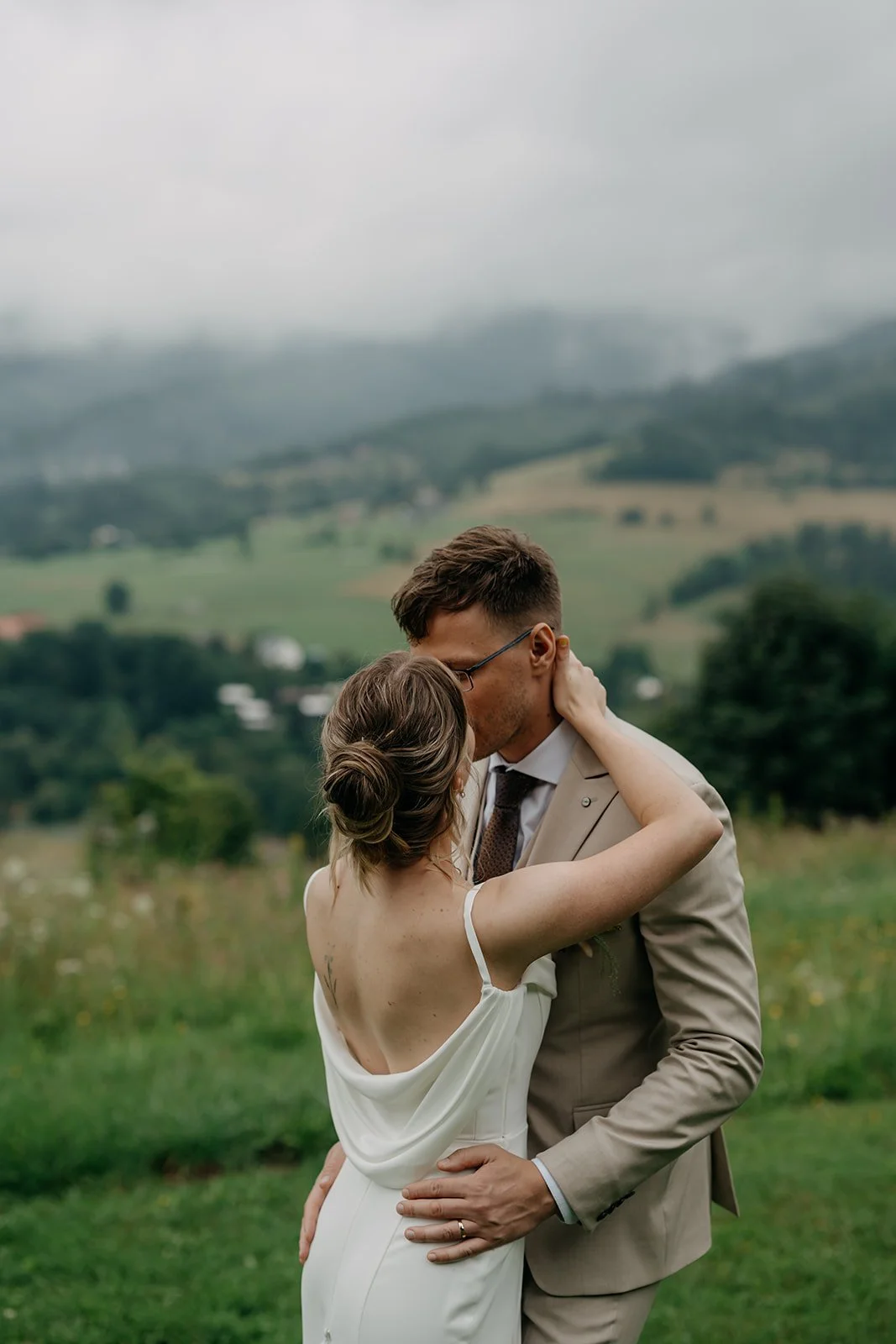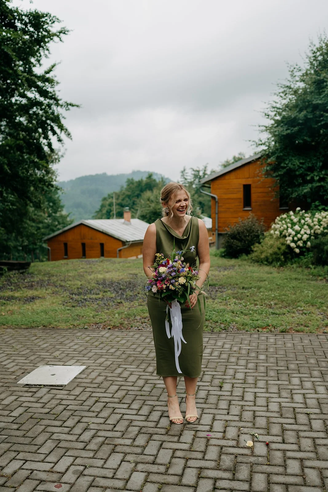 Svatba se konala v Beskydech. Den jsme začali obřadem v kostele a pak se přesunuli do kopců na svatební místo, kde už to celé plynulo vlastním tempem. Déšť nikoho nezastavil – spíš ještě víc semkl lidi dohromady.