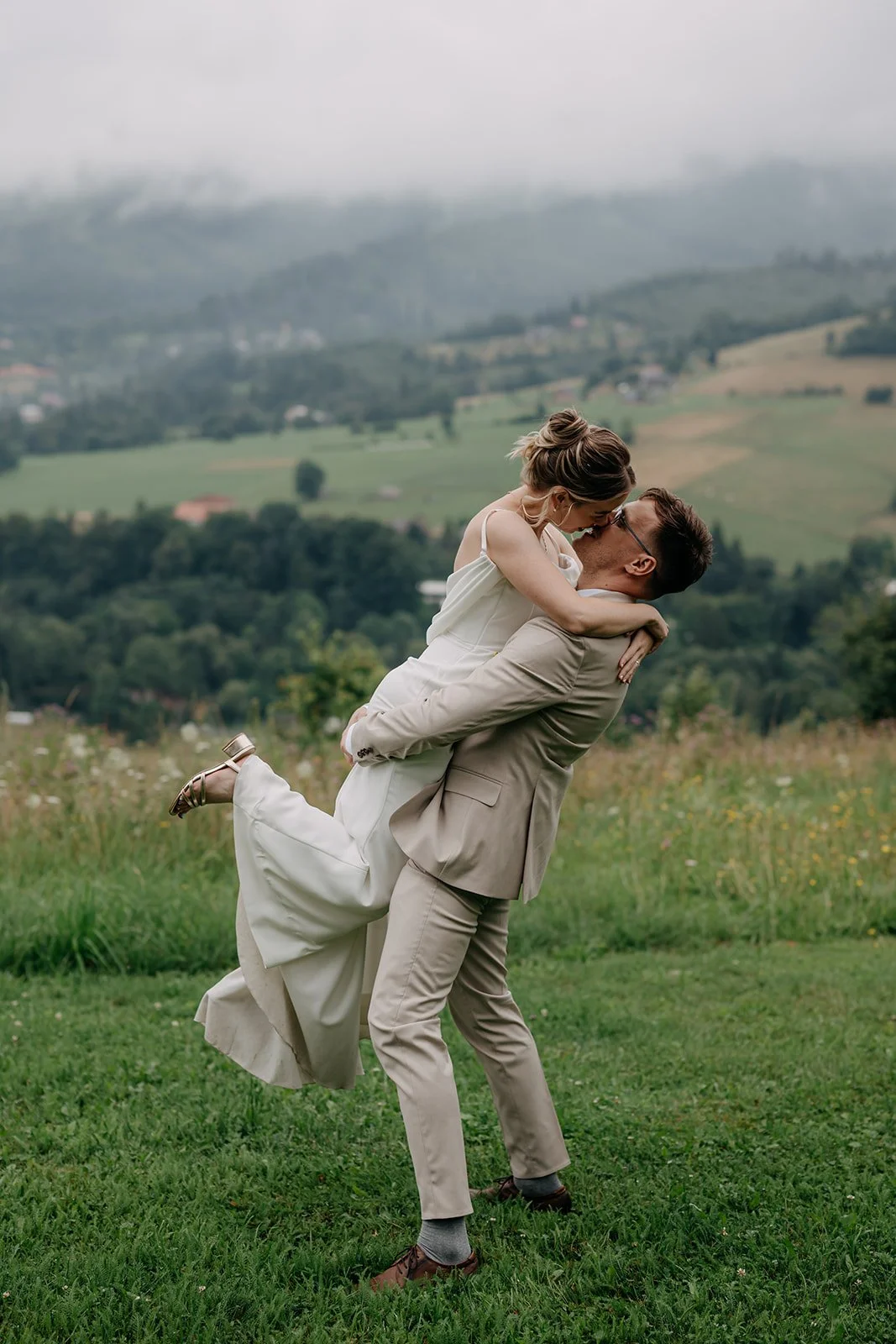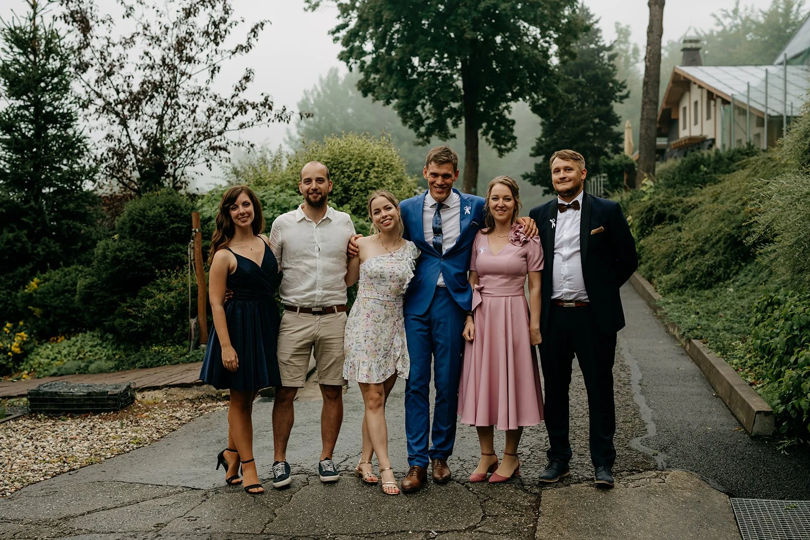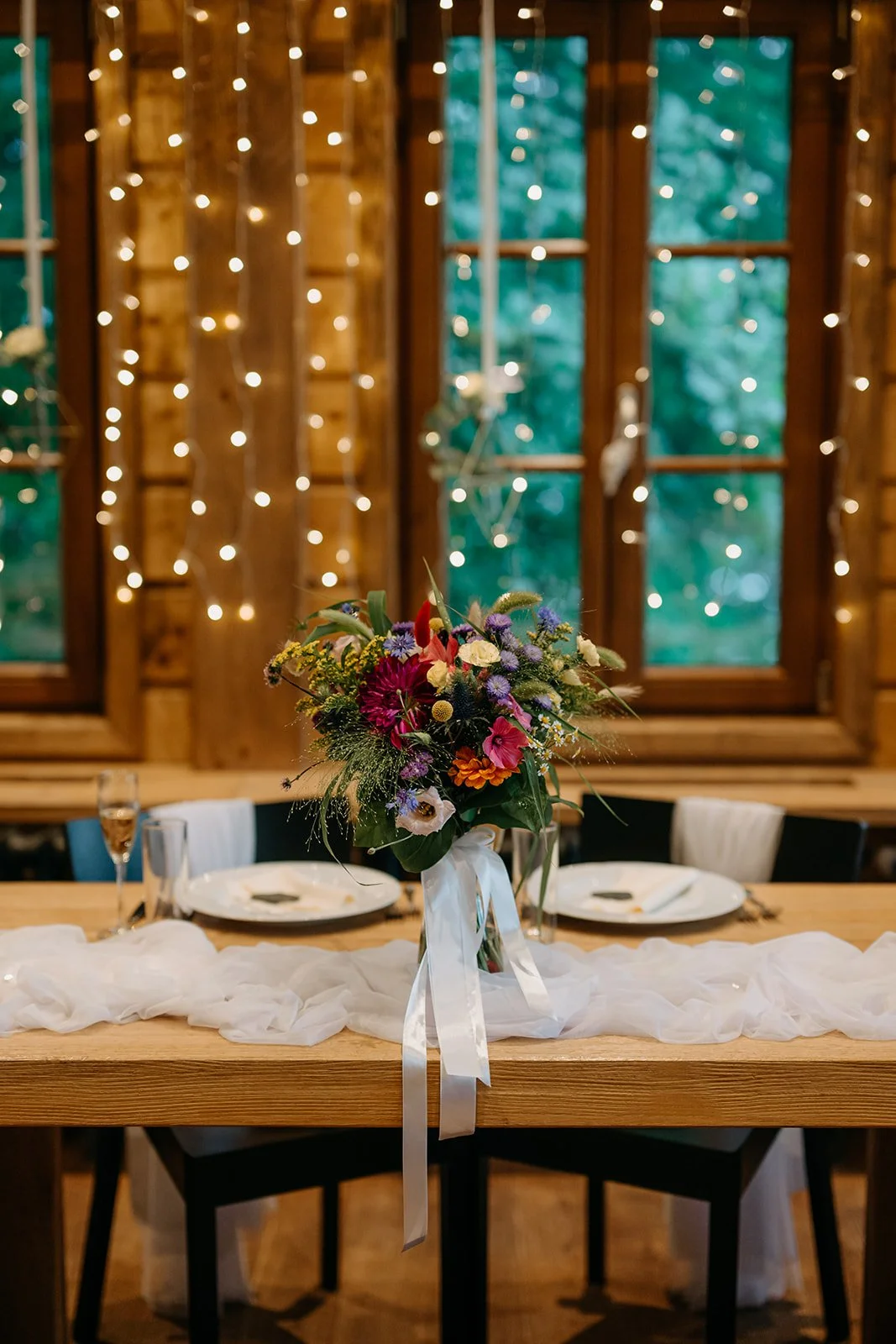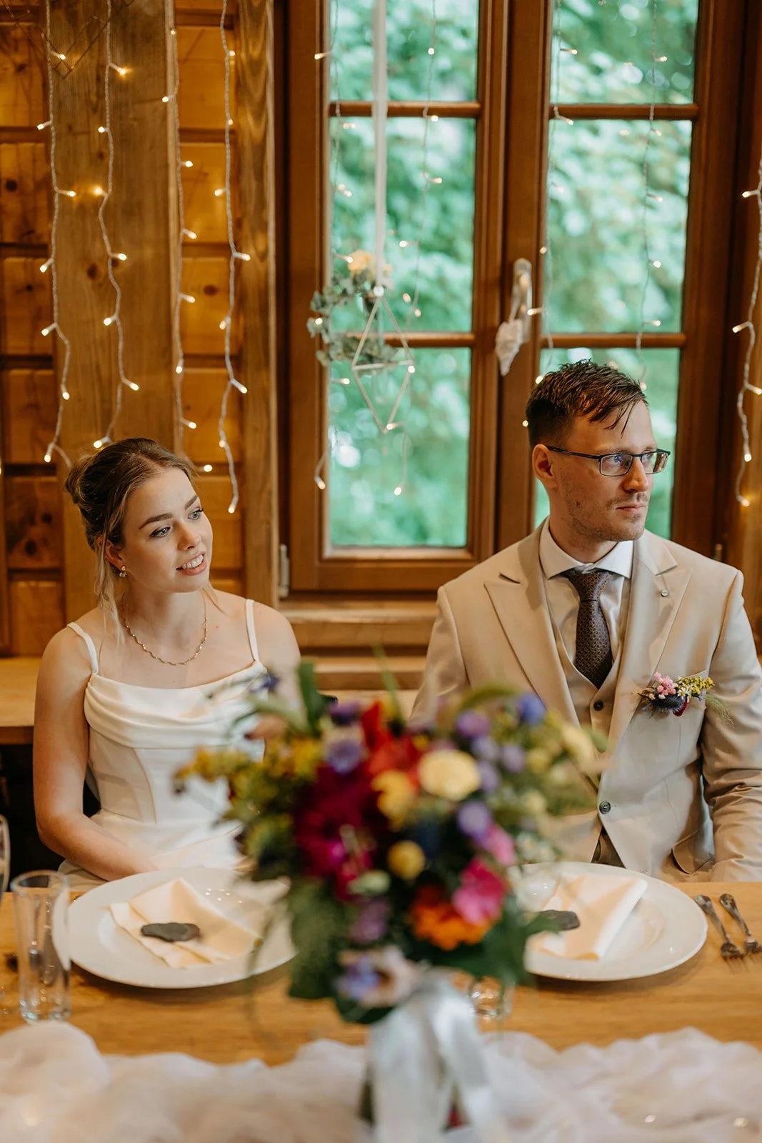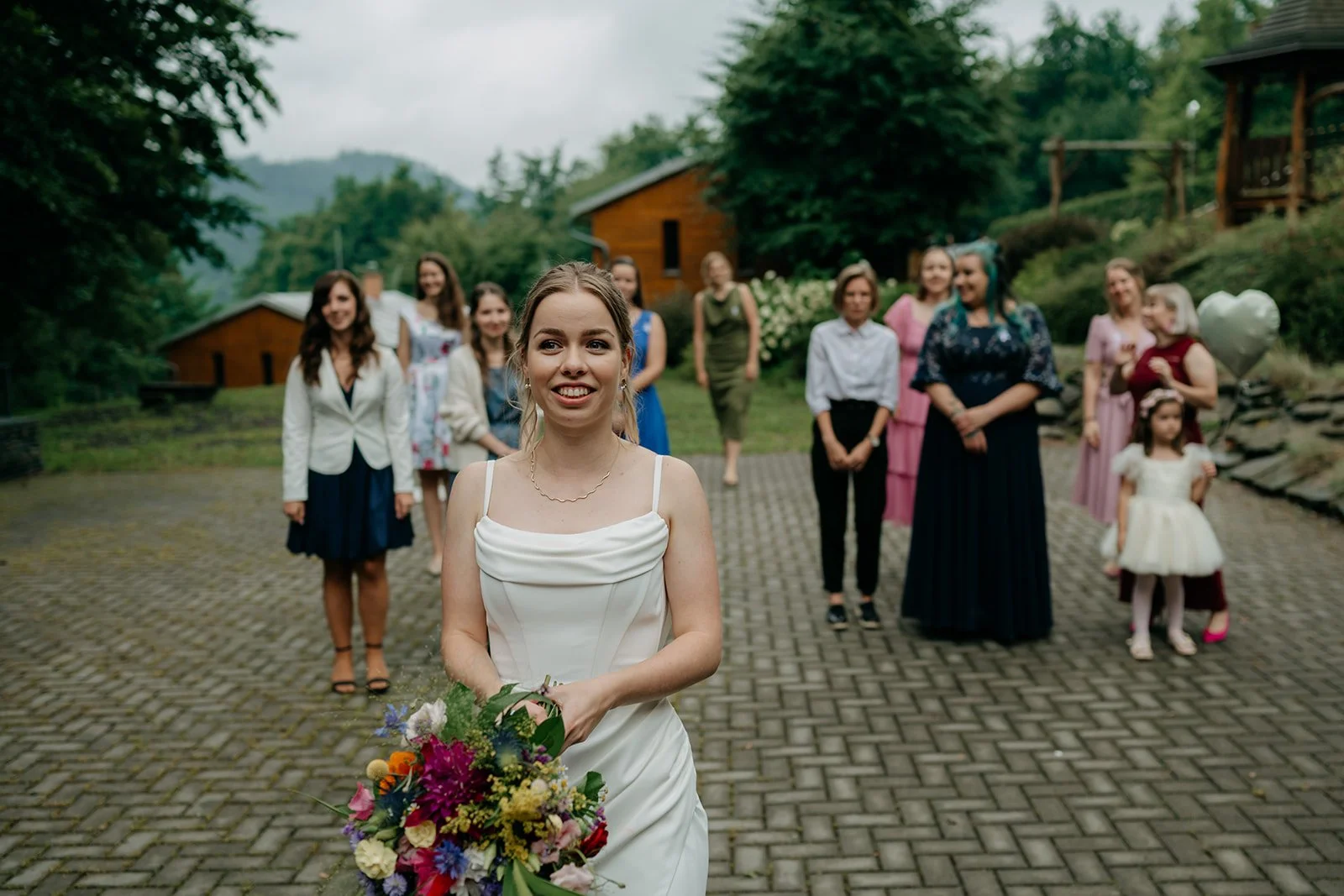 Svatba se konala v Beskydech. Den jsme začali obřadem v kostele a pak se přesunuli do kopců na svatební místo, kde už to celé plynulo vlastním tempem. Déšť nikoho nezastavil – spíš ještě víc semkl lidi dohromady.