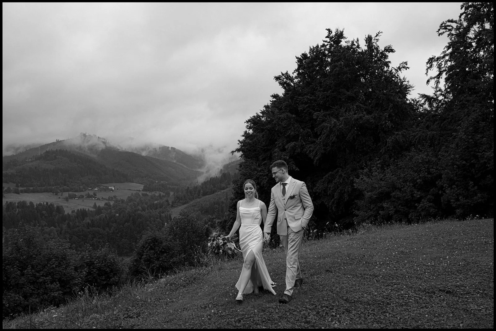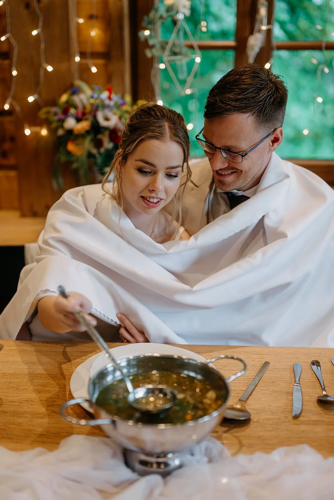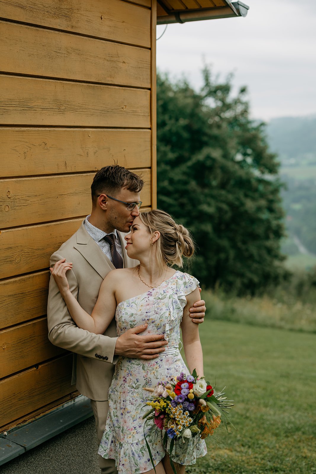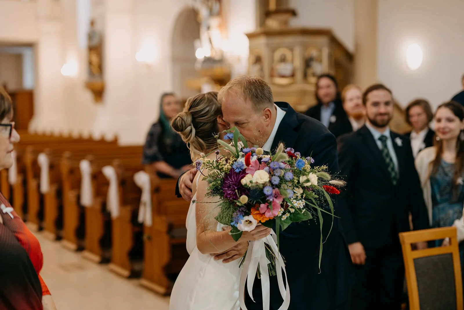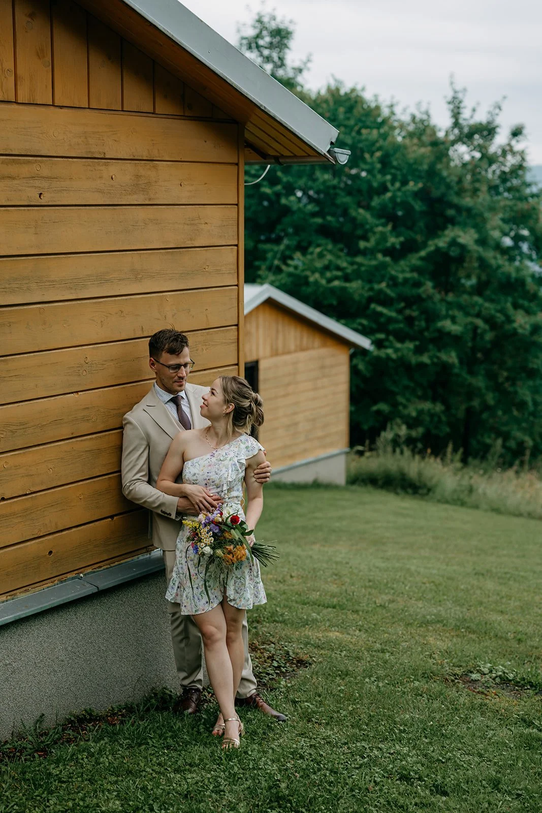 Svatba se konala v Beskydech. Den jsme začali obřadem v kostele a pak se přesunuli do kopců na svatební místo, kde už to celé plynulo vlastním tempem. Déšť nikoho nezastavil – spíš ještě víc semkl lidi dohromady.